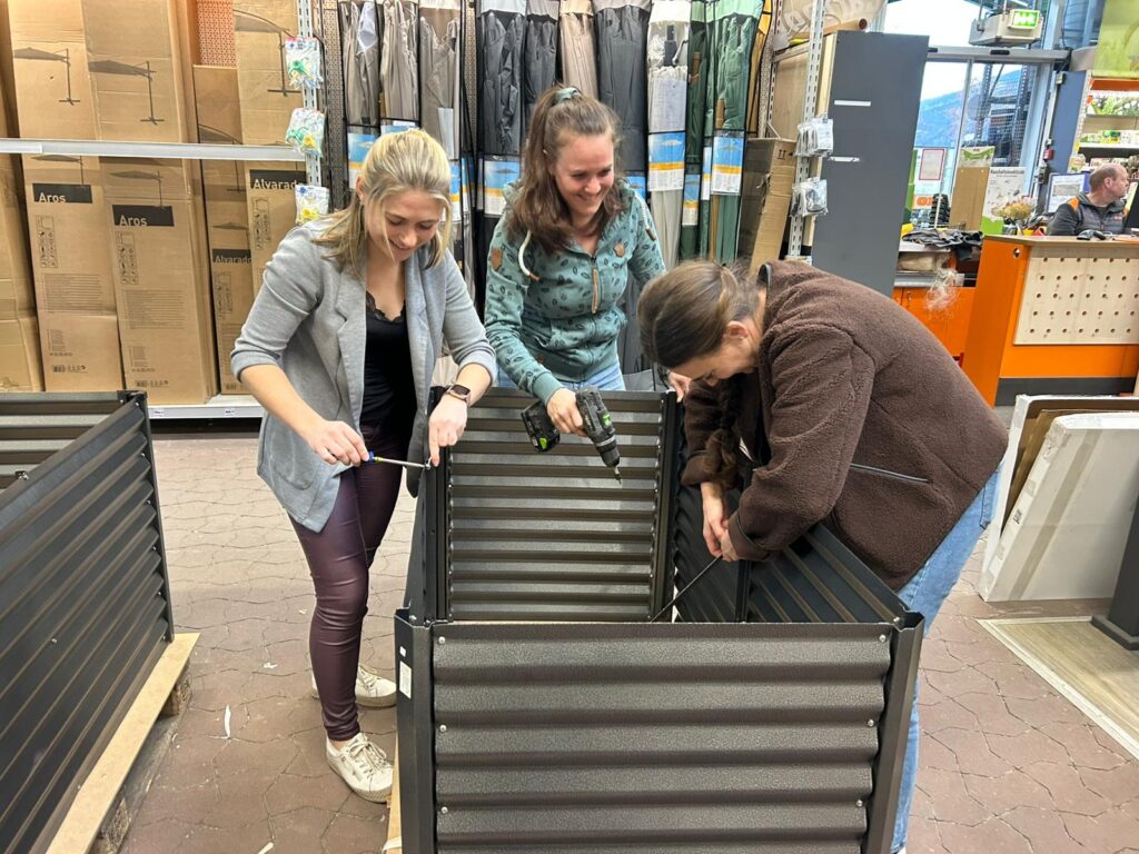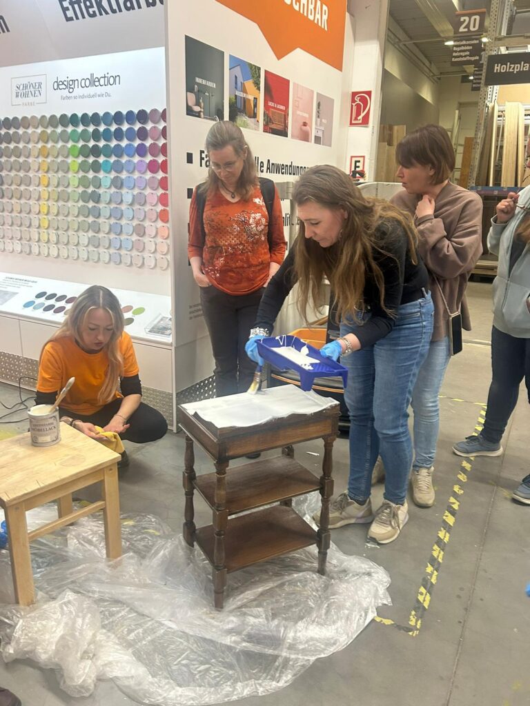 Die Idee dahinter ist einfach: Lernen soll nicht nur im Seminarraum stattfinden, sondern auch dort, wo praktische Fähigkeiten tatsächlich gebraucht werden. Genau deshalb wurde der OBI Markt bewusst als Veranstaltungsort gewählt. Die Teilnehmerinnen rotierten in kleinen Gruppen durch mehrere Workshopstationen und konnten verschiedene Themenbereiche ausprobieren – begleitet von erfahrenen OBI-Mitarbeiter:innen, die ihr Wissen praxisnah weitergaben.