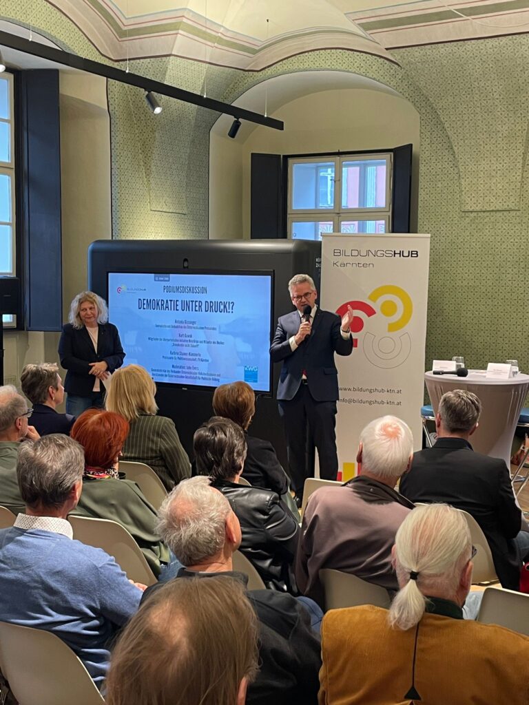 Rund 75 Teilnehmer:innen folgten am Donnerstag, den 12.03.2026 der Einladung des Bildungshub Kärnten und seines Kooperationspartners, der Volkswirtschaftlichen Gesellschaft, in den Grünen Saal des Kärntner Landtags. Im Mittelpunkt des Abends stand der Austausch über aktuelle Herausforderungen für demokratische Gesellschaften sowie die Frage, welche Rolle Medien, Bildung und gesellschaftlicher Dialog dabei spielen.