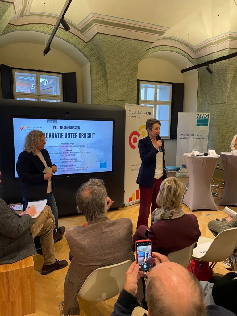 Eröffnet wurde die Veranstaltung von Beate Gfrerer, Geschäftsführerin der Kärntner Volkshochschulen und stellvertretende Vorsitzende des Bildungshub Kärnten. In ihren Begrüßungsworten betonte sie, wie wichtig solche Dialogformate sind: Sie schaffen Räume, in denen Menschen miteinander ins Gespräch kommen, Perspektiven austauschen und demokratische Kultur aktiv leben können.