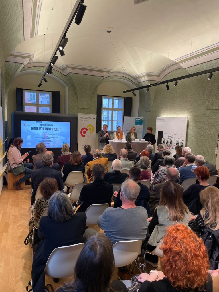 Auf dem Podium diskutierten drei Expert:innen über aktuelle Entwicklungen, Herausforderungen und mögliche Lösungsansätze für unsere demokratische Gesellschaft:
